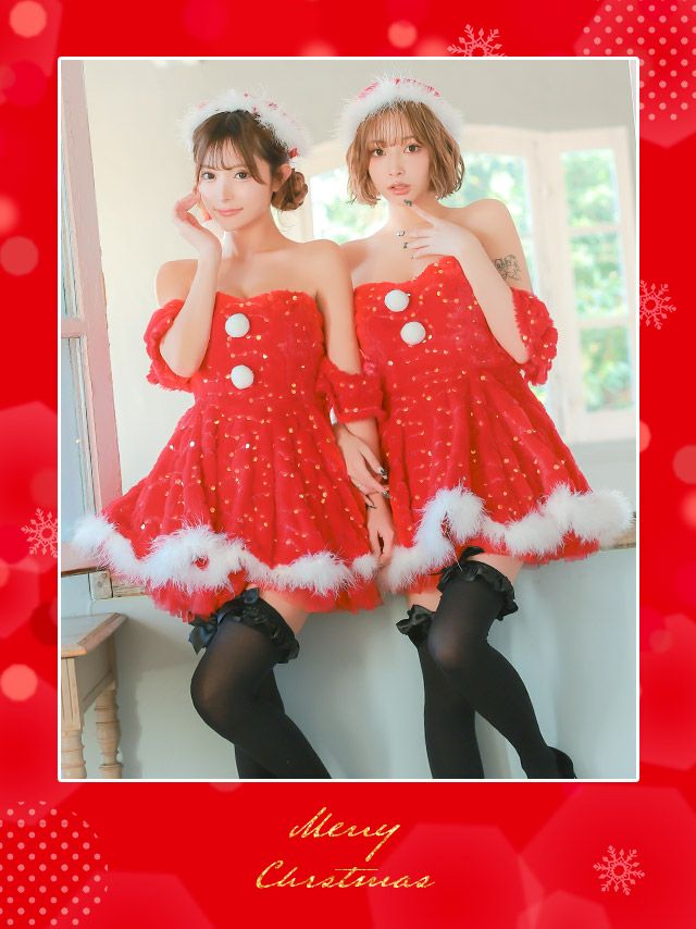 4. サンタコス 3点set オフショルもこもこスパンコールデザインフレア王道サンタツインコスプレ [ワンピース+サンタ帽子+ポンポン]