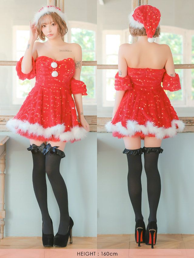 5. サンタコス 3点set オフショルもこもこスパンコールデザインフレア王道サンタツインコスプレ [ワンピース+サンタ帽子+ポンポン]
