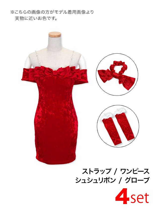 4. サンタコスプレ 4点set オフショルリボンパールキャミデザインセクシーボディコンタイトガーリードレス [ストラップ+ワンピース+シュシュリボン+グローブ]