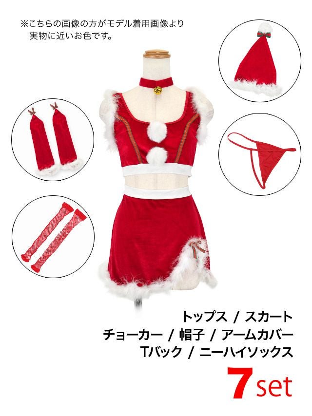 5. サンタコスプレ 7点set へそ出し セパレート セクシーふわふわ [トップス+スカート+サンタ帽子+ネックアクセサリー+網ニーハイソックス+アームアクセサリー+Tバック]
