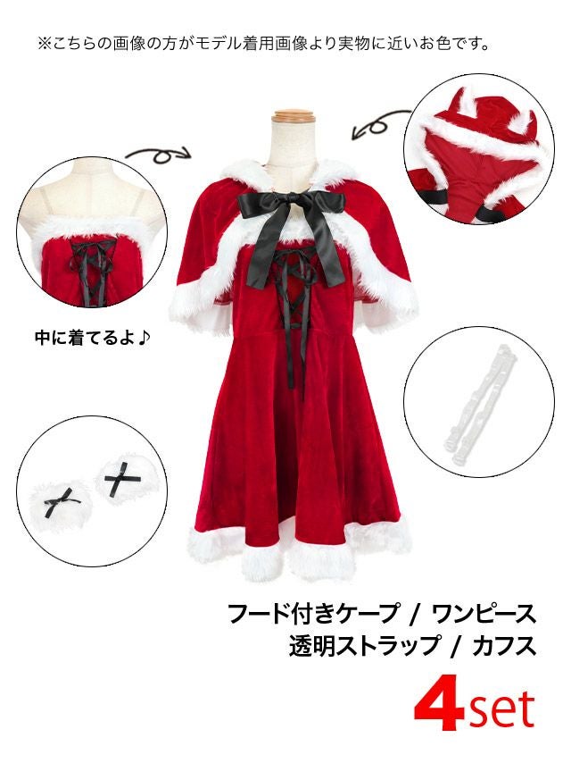 4. サンタコスプレ 4点set キャット レースアップリボン フレアスカート フード付きケープ ガーリー [フード付きケープ+ワンピース+カフス+透明ストラップ]