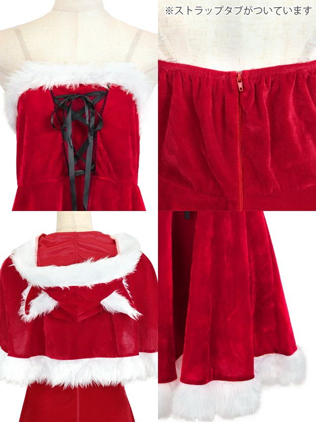 3. サンタコスプレ 4点set キャット レースアップリボン フレアスカート フード付きケープ ガーリー [フード付きケープ+ワンピース+カフス+透明ストラップ]