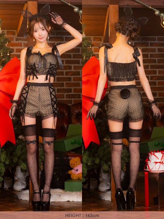 6. サンタコスプレ 5点set イースター バニー コスプレ へそ出し セクシー ヌーディーカラー ドットチュール レースアップ リボン ドレッシー アニマル [トップス+パンツ+カチューシャ+グローブ+しっぽ]