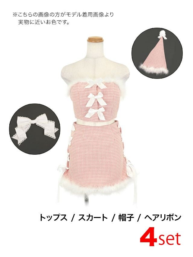 4. サンタコスプレ 4点set ピンク 千鳥柄 ホワイトリボン セットアップ へそ出し セクシー クリスマスコスプレ [トップス+スカート+帽子+ヘアリボン]