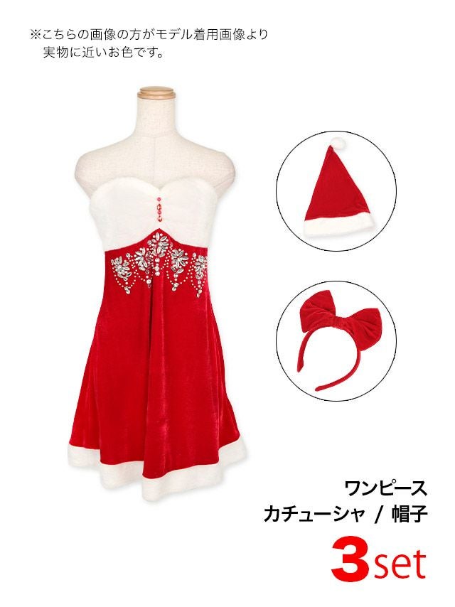 気分やシーンで帽子とカチューシャを選べちゃう♪ サンタコスプレ 3点set キラキラビジュー付き 谷間 セクシー フレアスカート 王道 [ワンピース+帽子+リボンカチューシャ]
