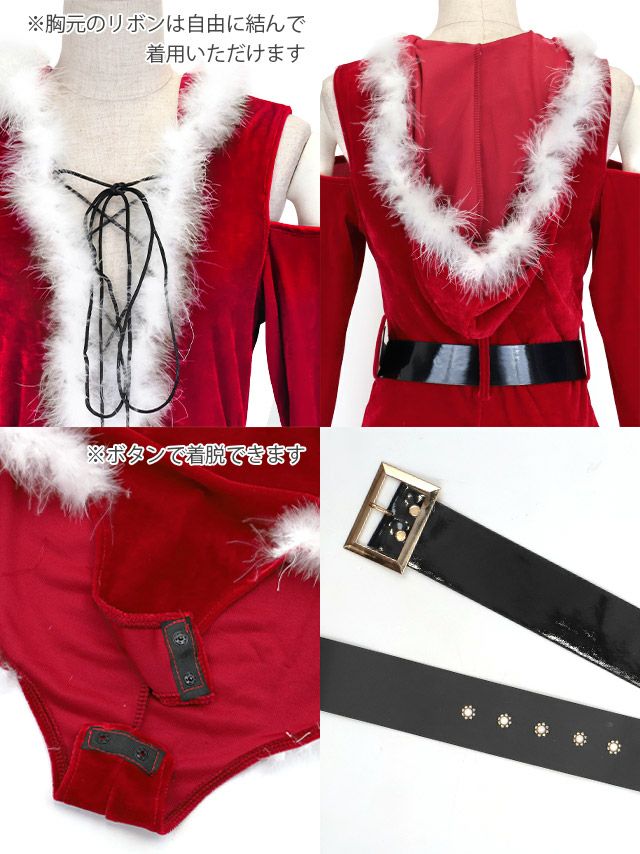 4. サンタコスプレ 2点set セクシー オープンショルダー フロントレースアップ 谷間 ふわふわ ハイレグ [オールインワン+ベルト]