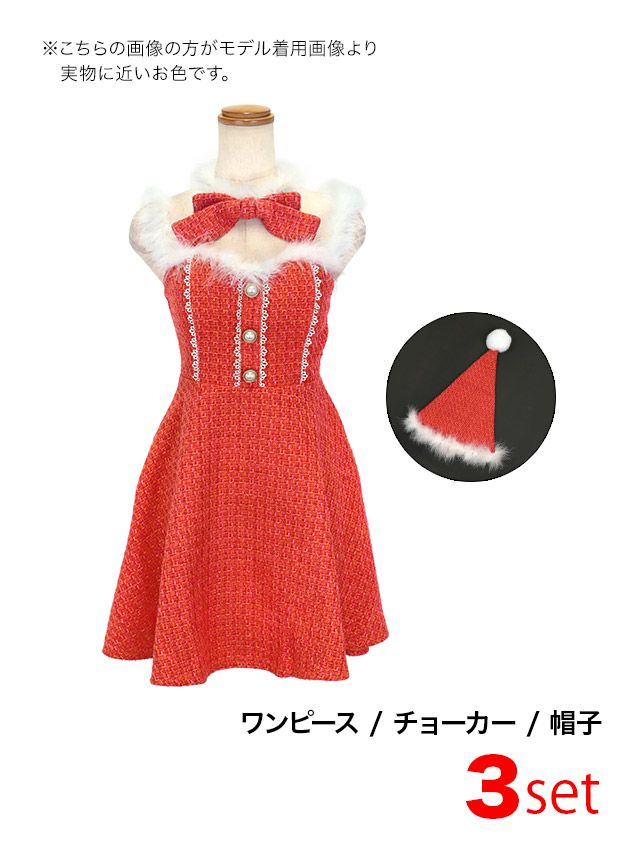 ガーリーで映えるお顔周りにメイク♡ サンタコスプレ 3点set ツイード リボン レース フレアスカート ガーリードレス [ワンピース+チョーカー+帽子]