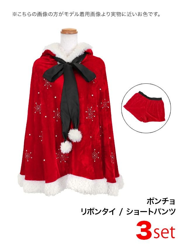 3. サンタコスプレ 3点set スノウビジュー フード付き ポンチョ 袖あり サテンリボン ポンポン [ポンチョ+リボンタイ+ショートパンツ]