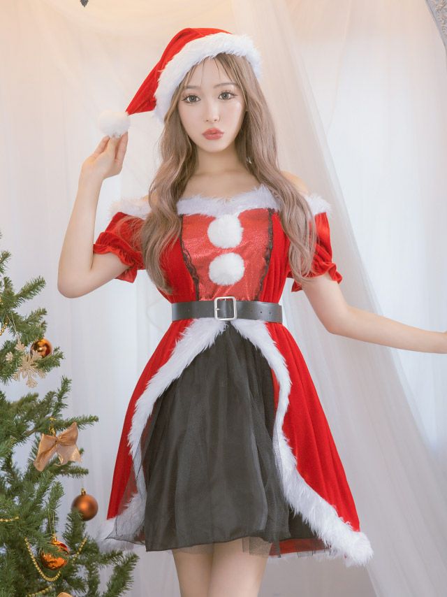 4. サンタコスプレ 4点set ベルト付きベロア袖ありオフショルふわふわファーレイヤードゴージャスチュールフレアスカート王道 [ワンピース+ベルト+サンタ帽子+透明ストラップ]
