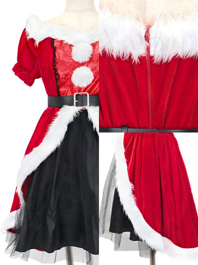 サンタコス 4点set ベルト付きベロア袖ありオフショルふわふわファーレイヤードゴージャスチュールフレアスカート王道サンタコスプレのイメージ画像3
