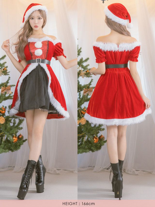 サンタコス 4点set オフショルふわふわポンポングリッターラメレイヤード風ボリュームチュールフレアスカート王道サンタコスプレの全身フロントバック画像