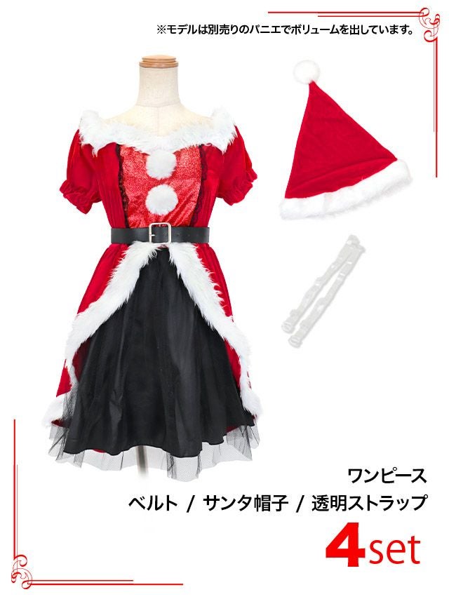 サンタコス 4点set オフショルふわふわポンポングリッターラメレイヤード風ボリュームチュールフレアスカート王道サンタコスプレのセット内容