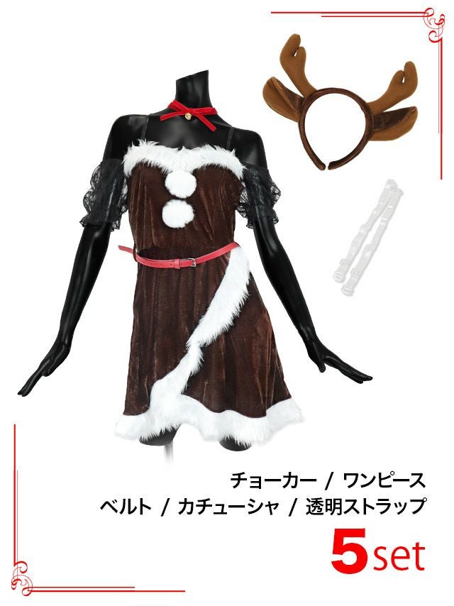 5. サンタコスプレ 5点set まやりん着用ラップフレアスカート2Wayオフショルトナカイアニマル [チョーカー+ワンピース+ベルト+カチューシャ+透明ストラップ+スカート+ベルト+ガーターリング]