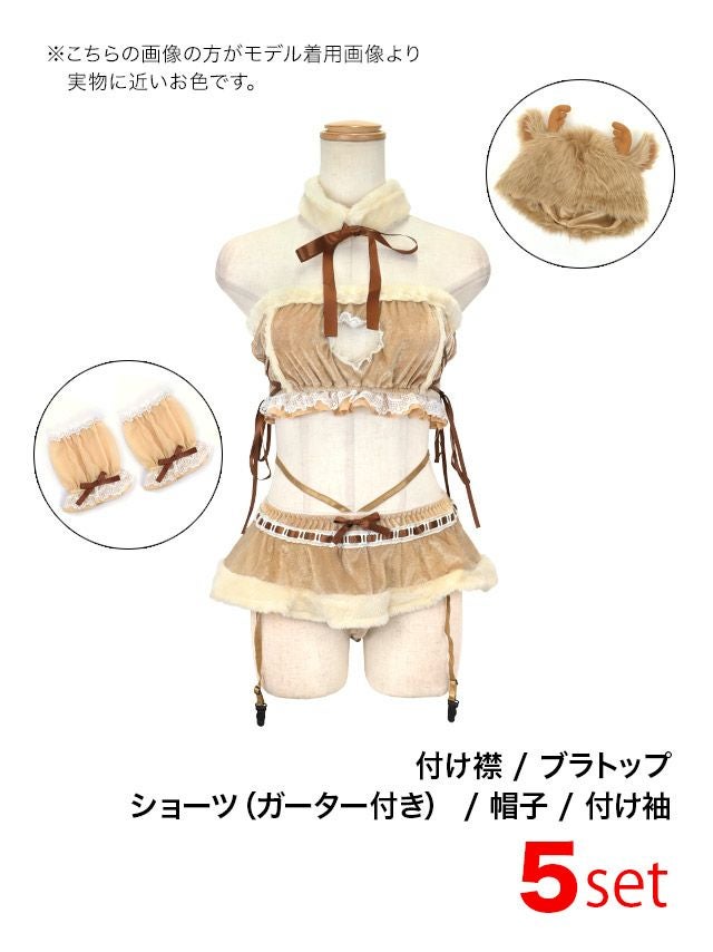 ふわもこのトナカイ帽子で写真映えも◎ サンタコスプレ 5点set セクシー谷間ハートカットフレアスカートランジェリートナカイアニマル [帽子+付け襟+ブラトップ+パンツ+付け袖]