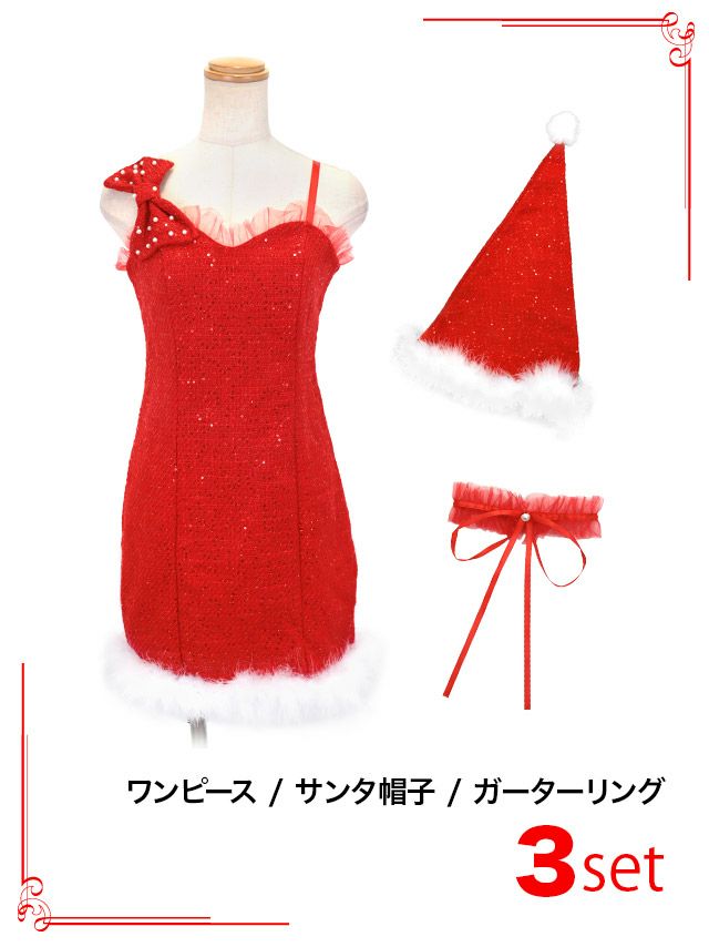 特別感溢れるガーリーサンタ♪ サンタコスプレ 3点set ワンショルリボンパールスパンコール付きツイードふわふわフェザードレス [ワンピース+サンタ帽子+ガーターリング]