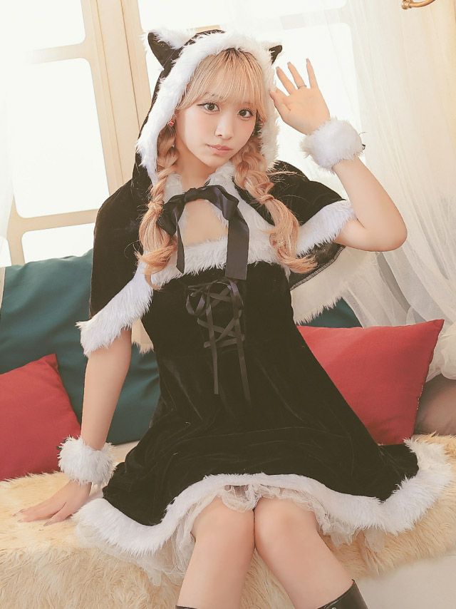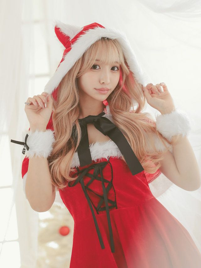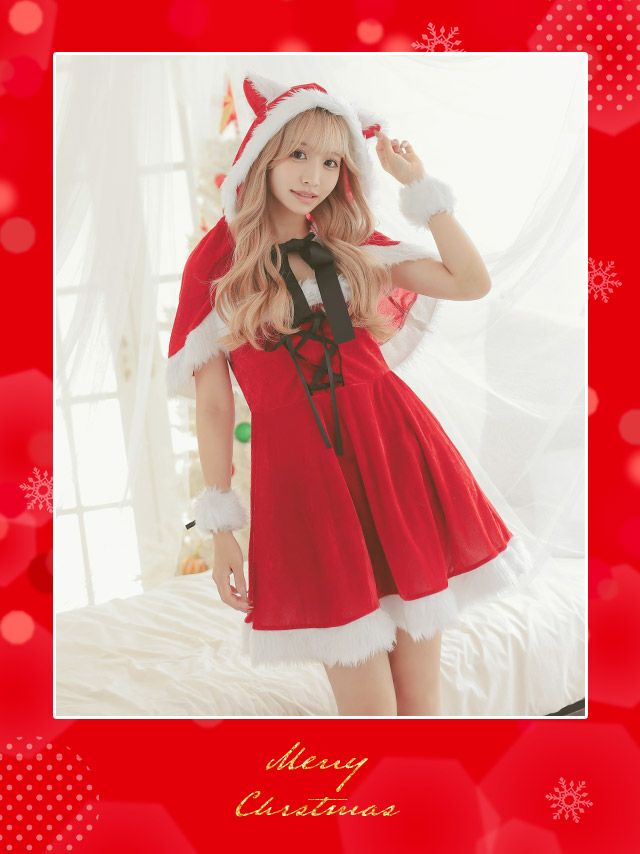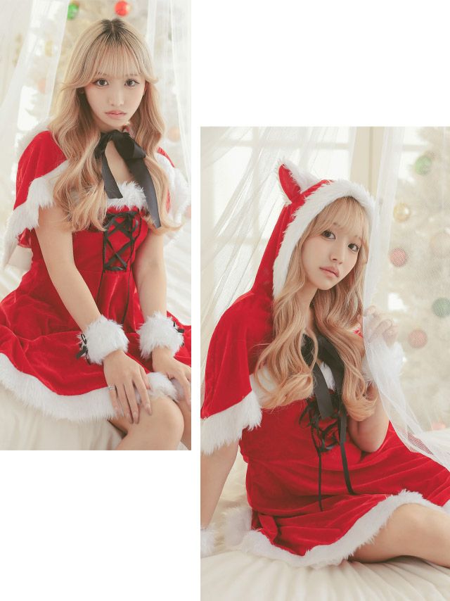 3. サンタコス 4点set まやりん着用ケープ付きふわふわファーレースアップフレアスカートガーリー猫アニマルサンタコスプレ [フード付きケープ+ワンピース+カフス+透明ストラップ]