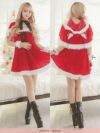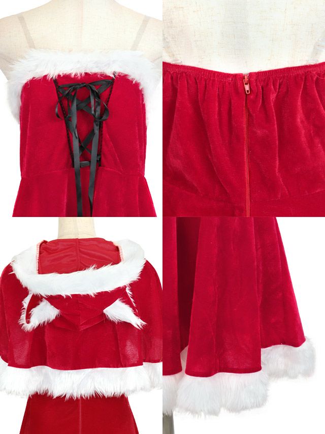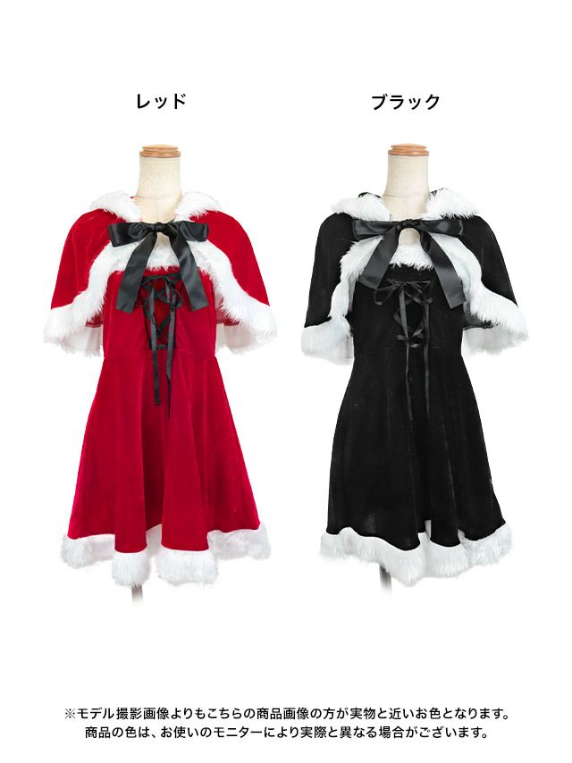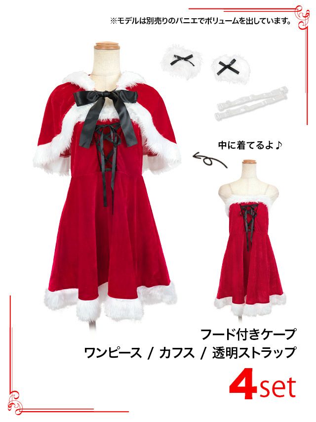 ケープなしでも着れちゃう2wayサンタ♪ サンタコス 4点set まやりん着用ケープ付きふわふわファーレースアップフレアスカートガーリー猫アニマルサンタコスプレ [フード付きケープ+ワンピース+カフス+透明ストラップ]