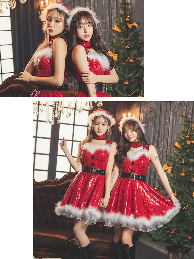 周囲の視線を独り占めできる♪ サンタコスプレ 4点set ふわふわファー付きキラキラスパンコールフレアスカート王道 [チョーカー+ワンピース+ベルト+サンタ帽子]