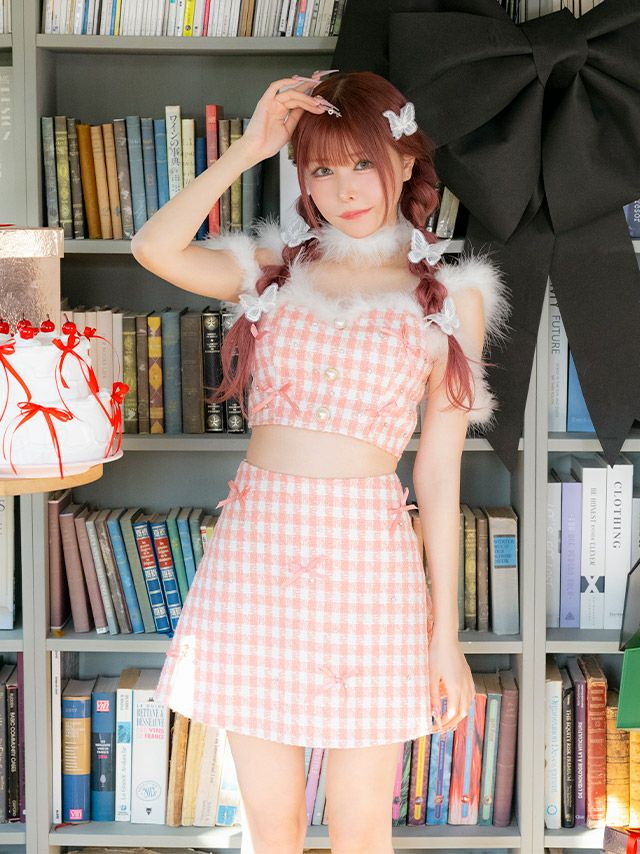 4. サンタコスプレ 3点set ツイード チェック リボン パールボタン へそ出し セクシー ふわふわフェザー 台形スカート ガーリードレス [トップス+スカート+チョーカー]