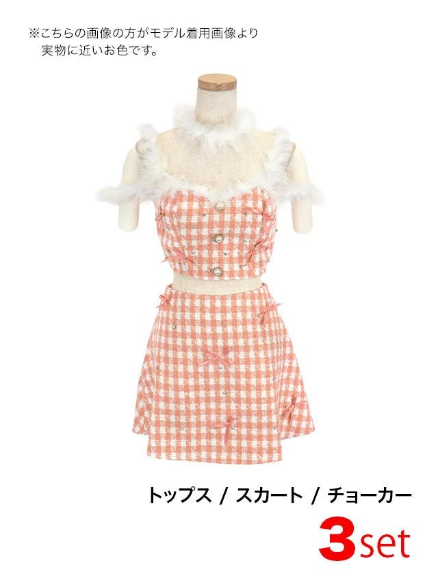 3. サンタコスプレ 3点set ツイード チェック リボン パールボタン へそ出し セクシー ふわふわフェザー 台形スカート ガーリードレス [トップス+スカート+チョーカー]