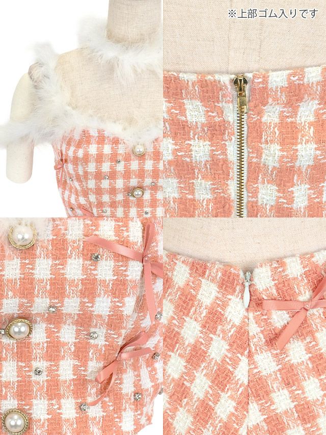 サンタコスプレ 3点set ツイード チェック リボン パールボタン ふわふわフェザー 台形スカート ガーリードレスの詳細アップ1 サンタコスプレ 3点set ツイード チェック リボン パールボタン ふわふわフェザー 台形スカート ガーリードレスの詳細アップ2