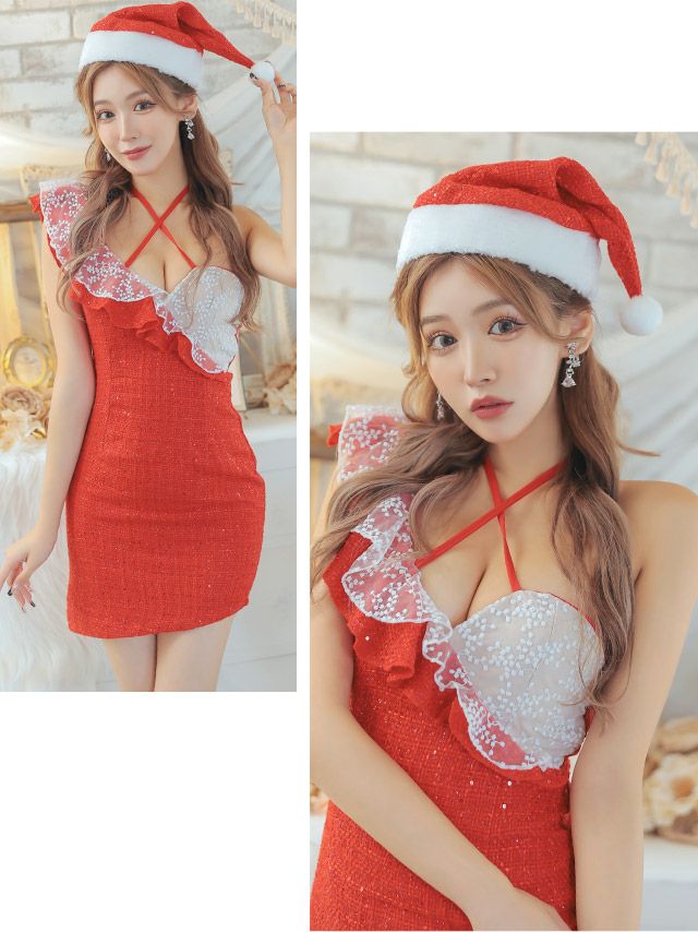 サンタコス 2点set シアーワンショルフリルクロスホルターネックツイードラメサンタコスプレのイメージ画像1