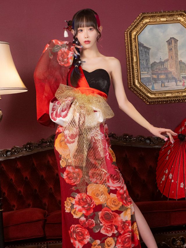 12/26再入荷★個性的なデザインで周囲と差を付けれる♪ [コスプレ] コスプレ 花魁 新年 正月 お化けの日 セクシー ワンショル スリット ローズ 和装ドレス 3点セット (着物ドレス/帯2種) ゆりにゃ×戦慄かなのTikaコラボ