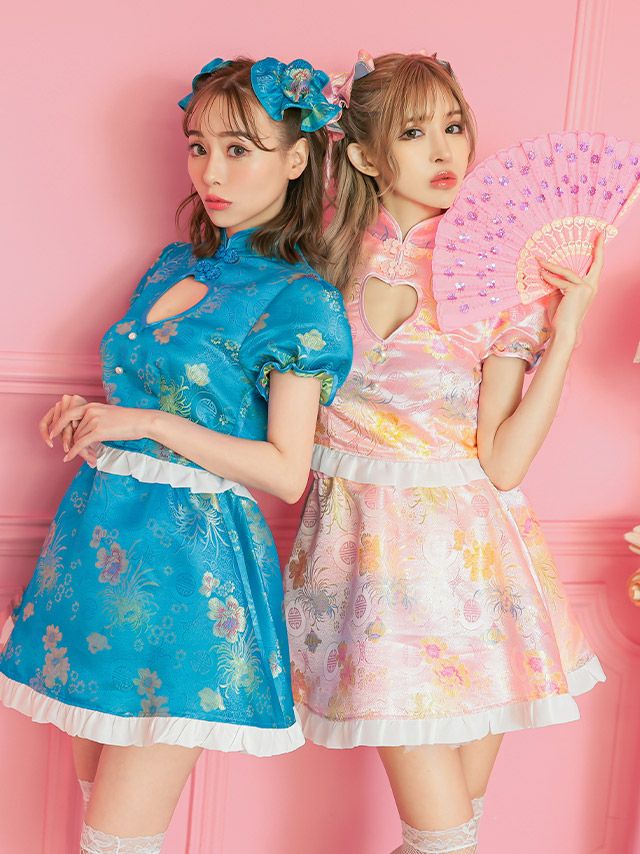 5. [コスプレ] 花柄フリルハートカットアウトフレアスカートデザインセパレートガーリーチャイナ服 [3点セット] (トップス/スカート/髪飾り)