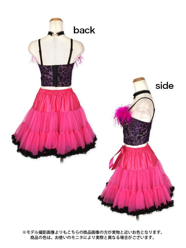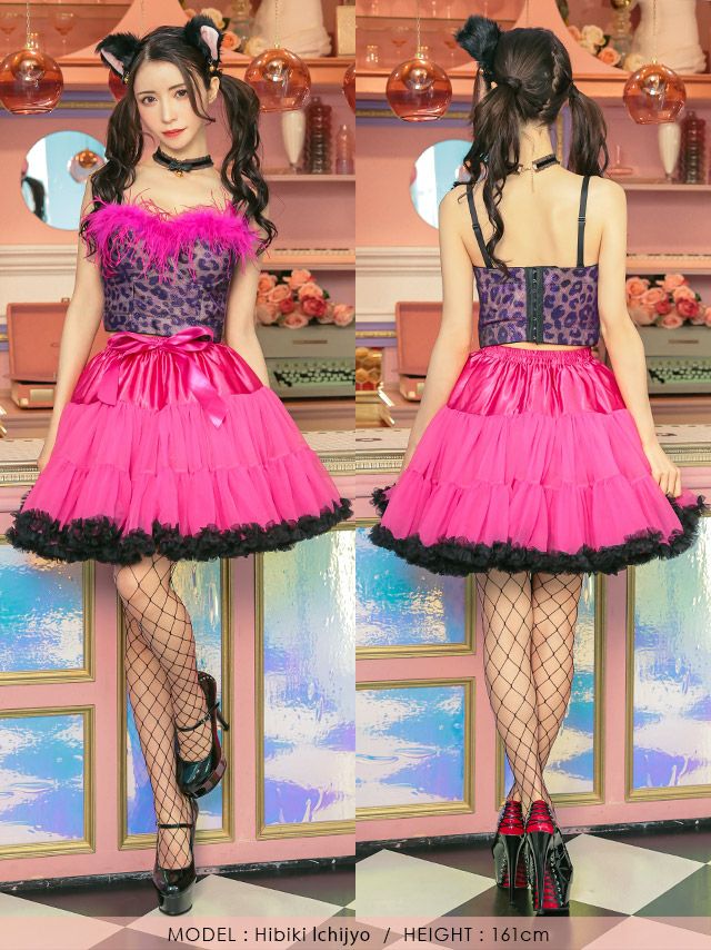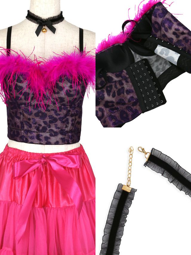 3. [コスプレ] ふわふわフェザー付きレオパードコルセット×リボン付きガーリーフリルシフォンフレアスカートツイン猫アニマル [4点セット] (トップス/スカート/チョーカー/カチューシャ)