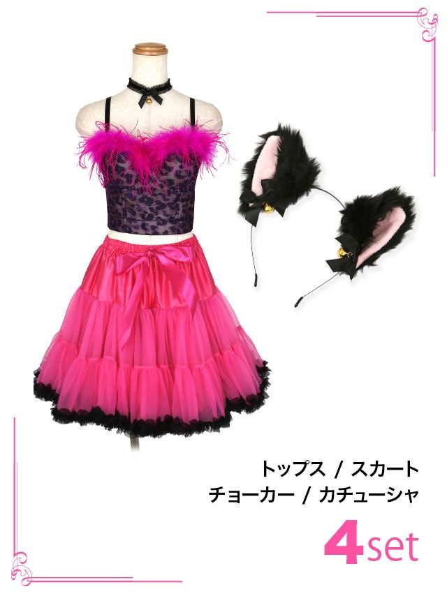 4. [コスプレ] ふわふわフェザー付きレオパードコルセット×リボン付きガーリーフリルシフォンフレアスカートツイン猫アニマル [4点セット] (トップス/スカート/チョーカー/カチューシャ)