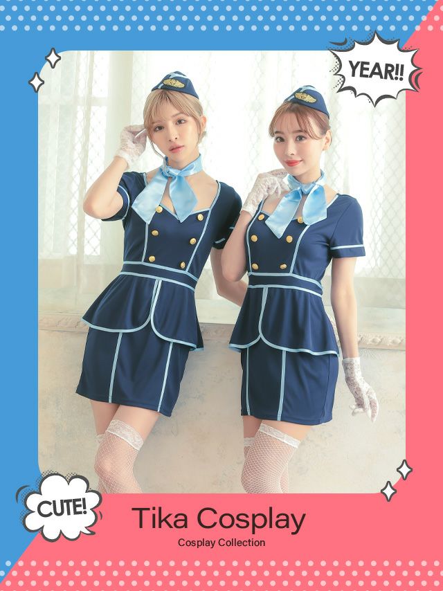 3. [コスプレ] ブルーバイカラー体型カバーツインスチュワーデス [5点セット] (ワンピース/スカーフ/手袋/ミニハット/ヘアピン)