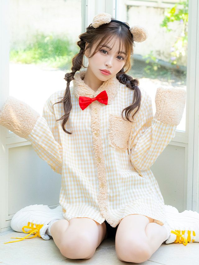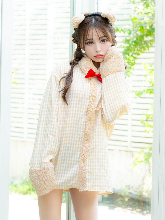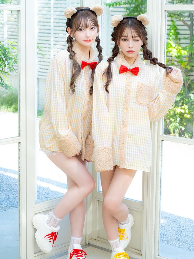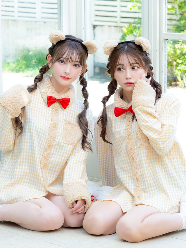 彼シャツ風であざと可愛いを演出♪ [コスプレ] 袖ありチェックシャツガーリーテディベア体型カバーツインアニマル [3点セット] (カチューシャ/シャツ/リボンブローチ)