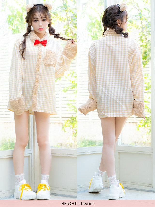 袖ありチェックシャツガーリーテディベア体型カバーアニマルのフロントバック全身