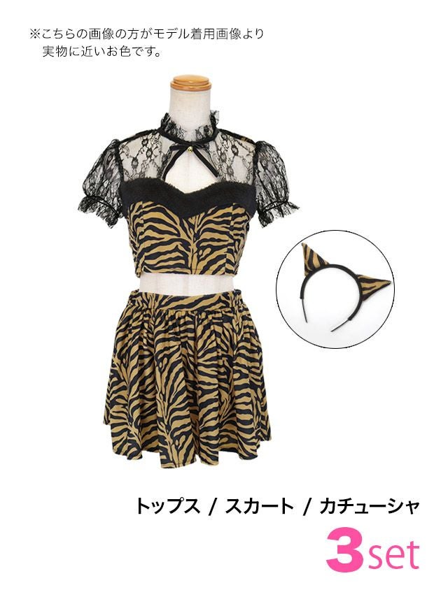3. [コスプレ] 鬼 アニマル バストカットデザインへそ出しフレアスカート [3点セット] (トップス/スカート/カチューシャ)