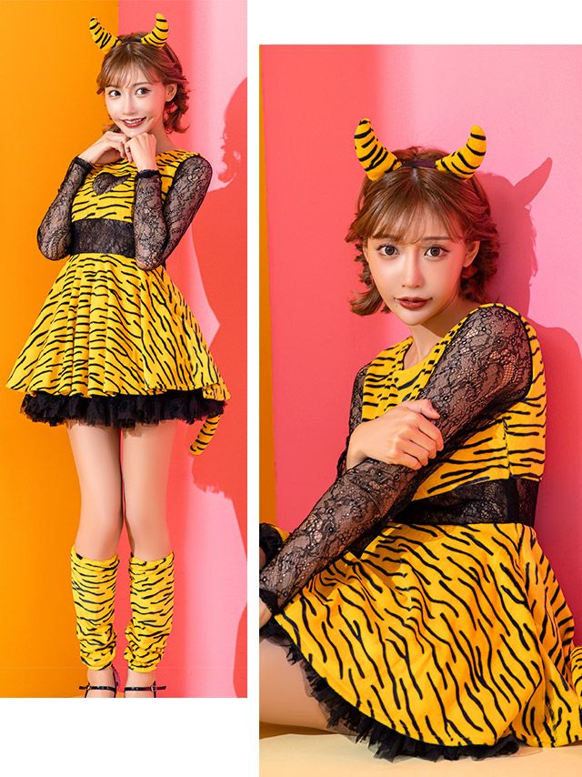 5. [コスプレ] 鬼 節分 お化けの日 ブラックレースハートカット袖あり体型カバーフレアスカートガーリーアニマル [4点セット] (ワンピース/カチューシャ/レッグカバー/マスク)