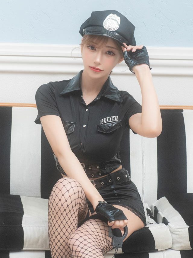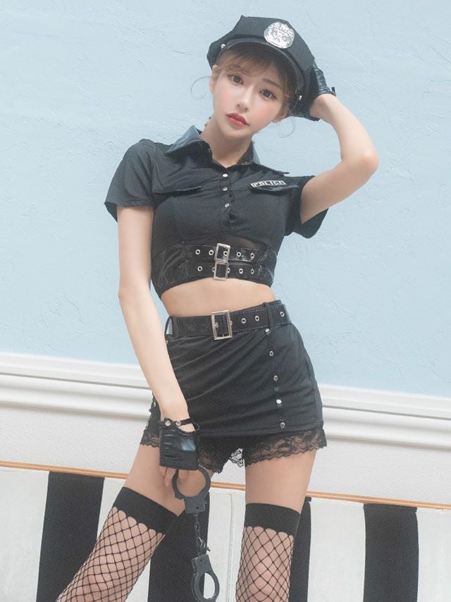 見る人みんなが捕まりたくなる♪ [コスプレ] ポリス コスプレ へそ出し マイクロミニスカ セクシー 8点セット (トップス/スカート/ベルト/帽子/グローブ/手錠/Tバック/ニーハイソックス)