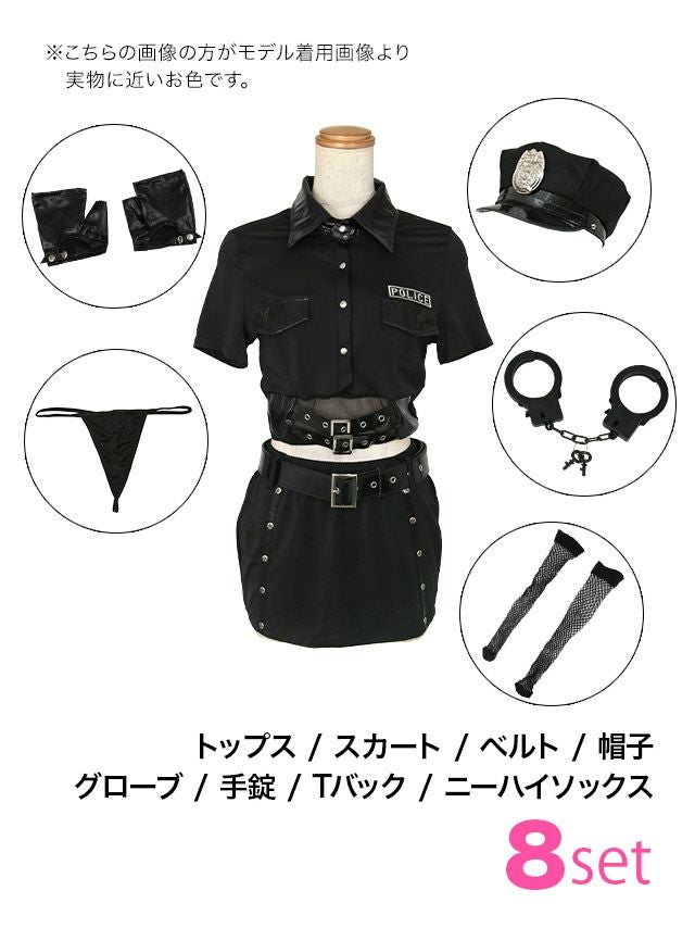 5. [コスプレ] ポリス コスプレ へそ出し マイクロミニスカ セクシー 8点セット (トップス/スカート/ベルト/帽子/グローブ/手錠/Tバック/ニーハイソックス)