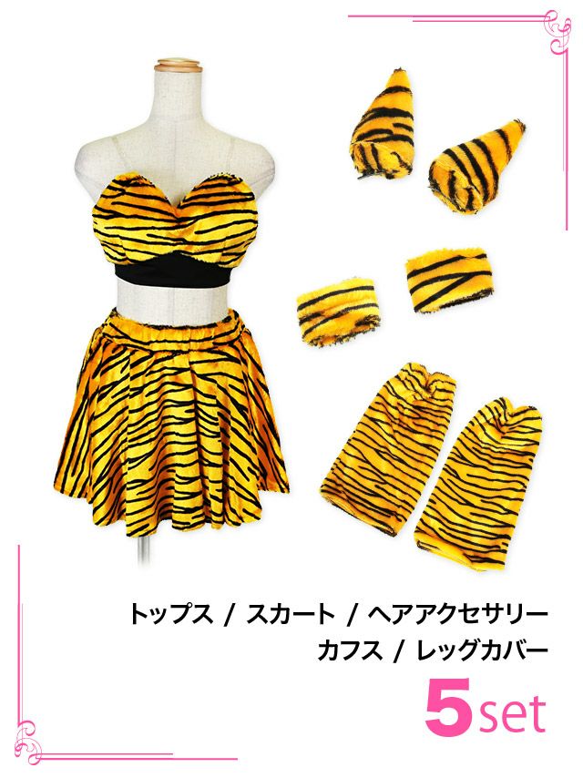5. [コスプレ] 鬼 新年 正月 お化けの日 へそ出し フレアスカートガーリーアニマル [5点セット] (トップス/スカート/ヘアアクセサリー/カフス/レッグカバー)