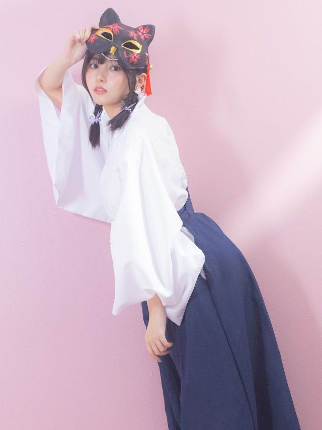 3. [SUPER SALE] コスプレ 巫女 コスプレ 体型カバー 袖あり 長袖 ロング丈 和装 ガーリー ウエストリボン 2点セット (上衣/袴)