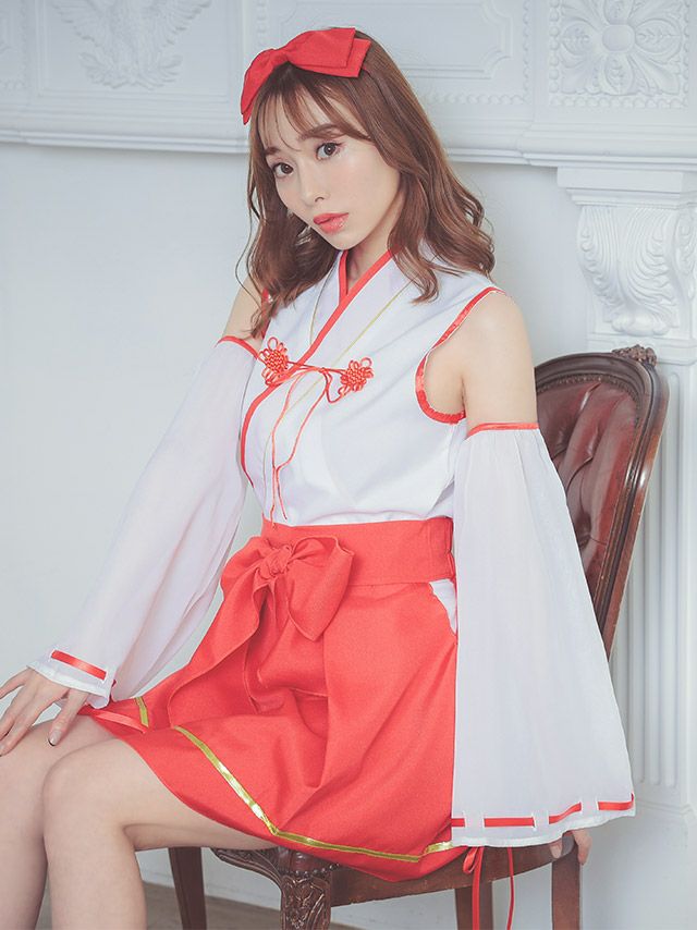 5. [コスプレ] 巫女 和装 新年 正月 お化けの日 ミニ丈袖あり体型カバーフレアスカート巫女ガール [4点セット] (カチューシャ/着物/付け袖/スカート)