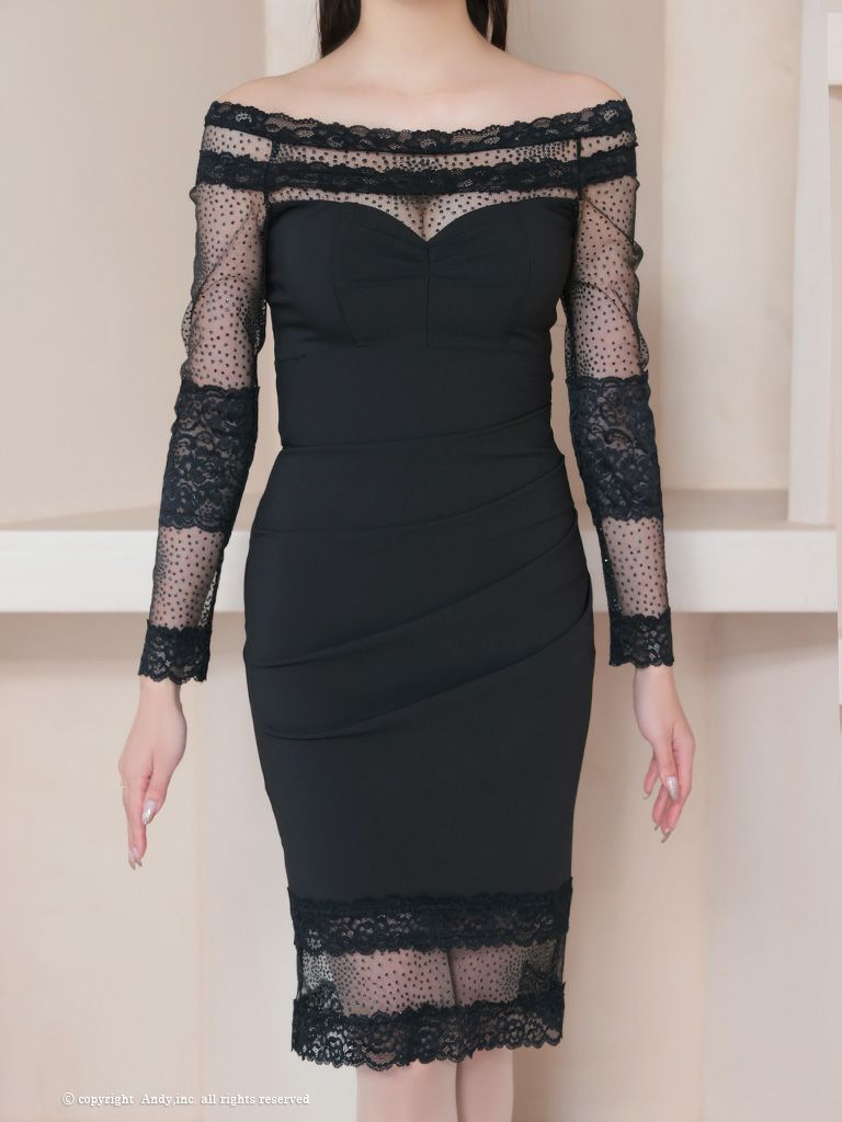 6. [Andy/アンディ] 高級 バストシースルー ウエストカット 長袖 袖あり オフショルダー ドット柄 レース ワンカラー タイト 谷間魅せ 膝丈ドレス