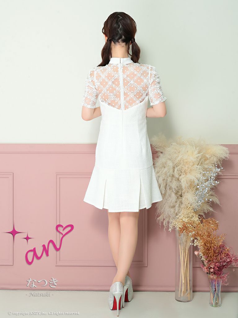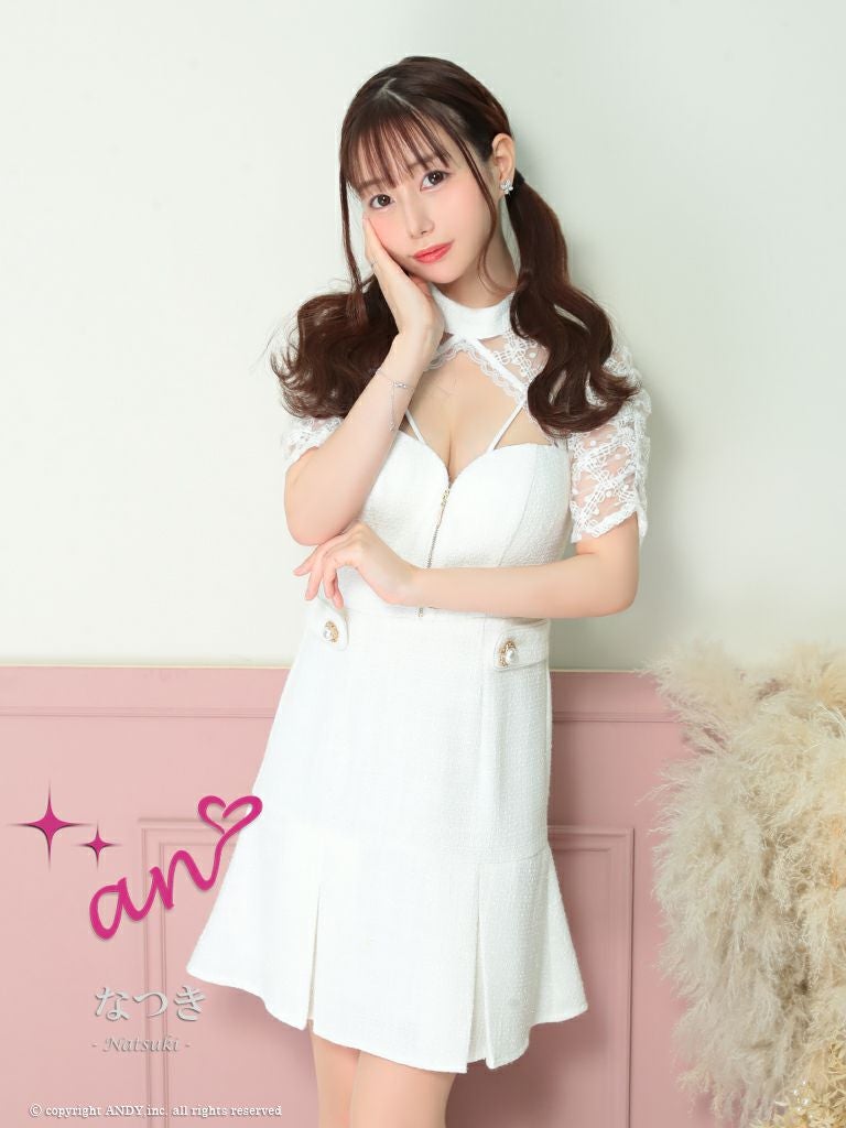キャバドレス an アン 高級半袖ジップラメツイードドット柄レースボタンフレアミニドレス