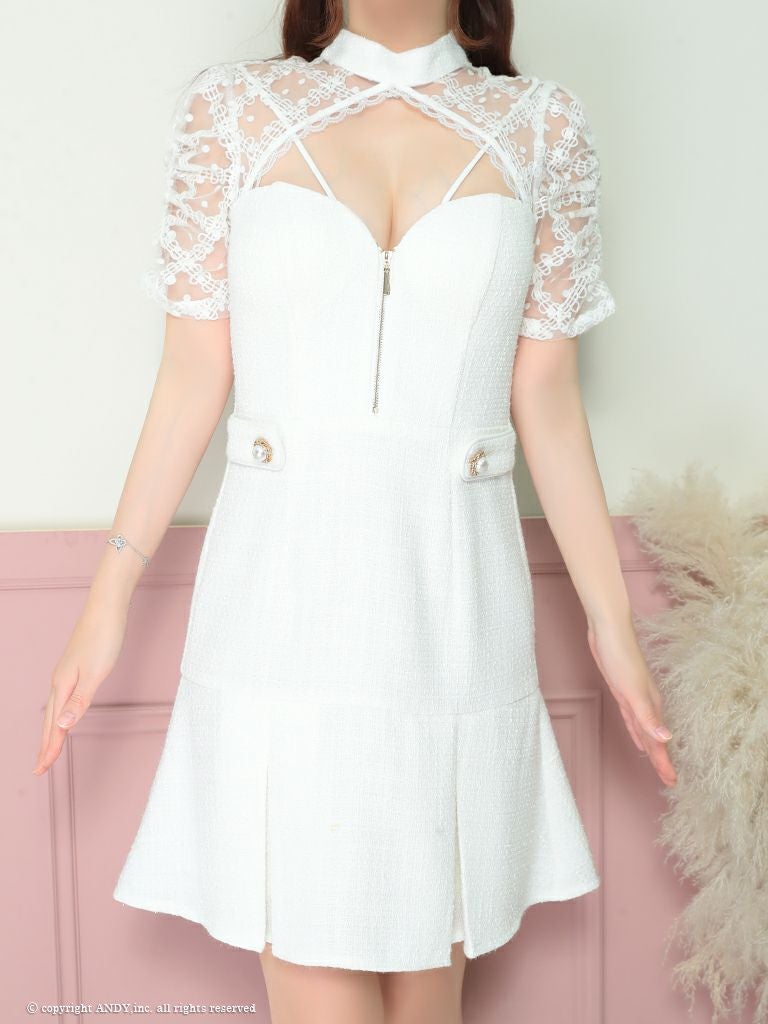 程良い肌魅せが魅力的☆ [an/アン] 高級半袖 ジップ ラメツイード ドット柄 レースボタン フレアミニドレス