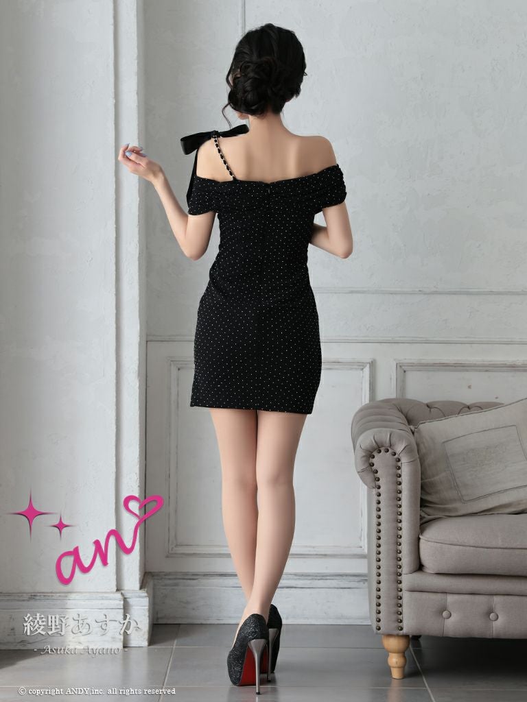 キャバドレス an アン 高級オフショルダードット柄ビジューリボンジップタイトミニドレス