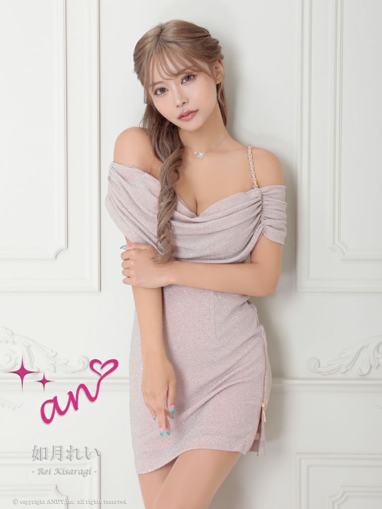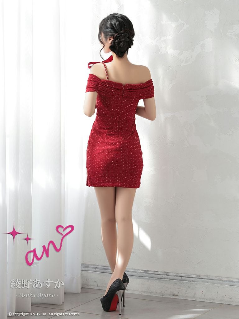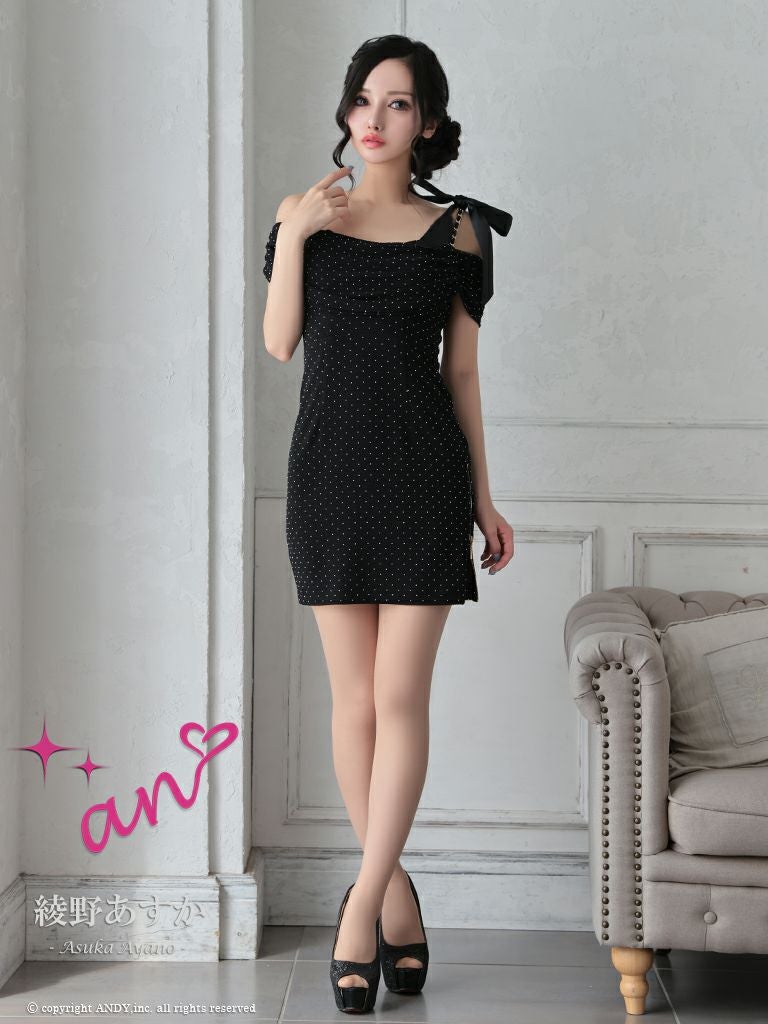 キャバドレス an アン 高級オフショルダードット柄ビジューリボンジップタイトミニドレス