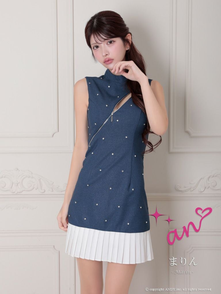 5. [an/アン] 高級ノースリーブ ジップ ドット柄 ビジュー フレアミニドレス
