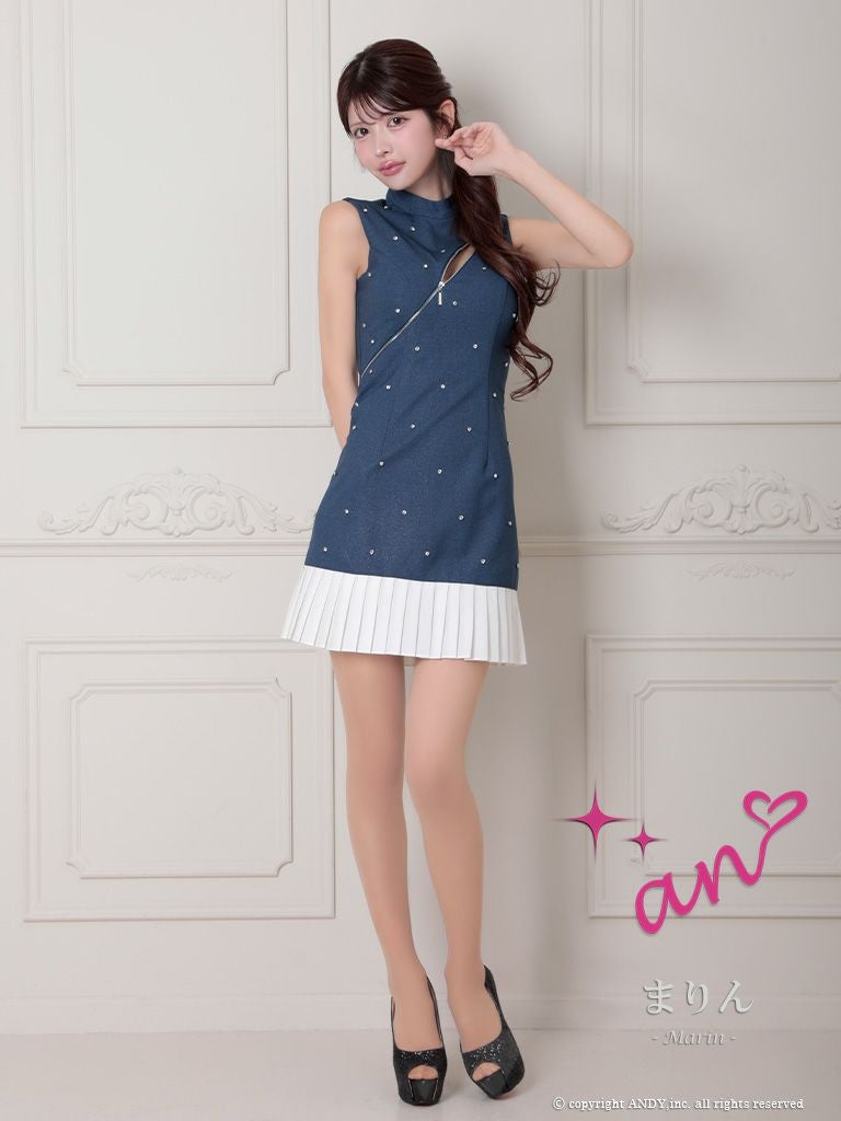 5. [an/アン] 高級ノースリーブ ジップ ドット柄 ビジュー フレアミニドレス