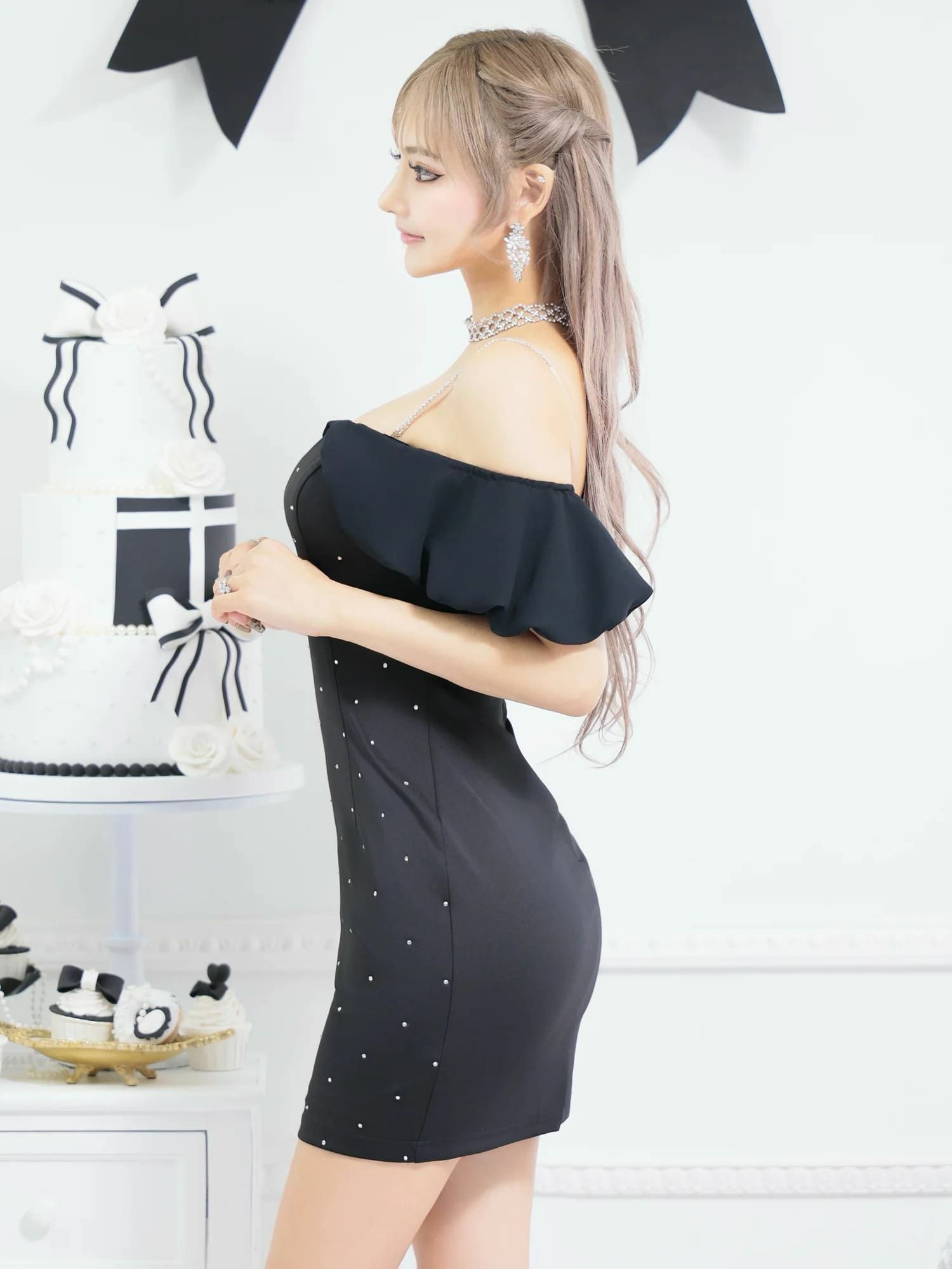 3. [Angel-R/エンジェルアール] 高級 オフショルダー フリル ドット柄 ビジューストーン バストカット 谷間魅せ タイトミニドレス