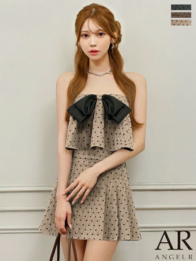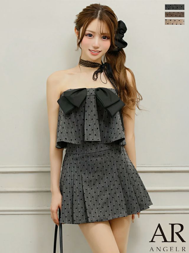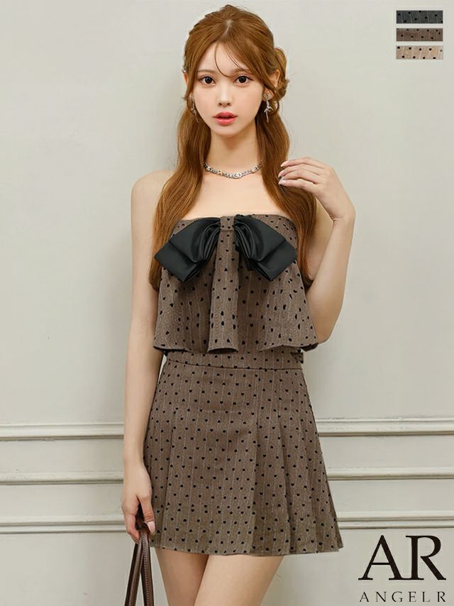 ビッグリボンが可愛すぎる一着♡ [Angel-R/エンジェルアール] 高級 2way ドット柄 キャミソール ベアトップ フロントリボン プリーツ セットアップ フレアミニドレス