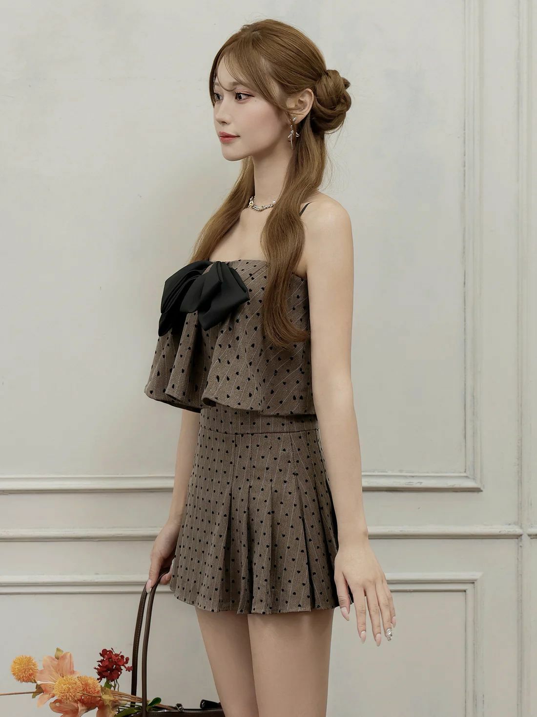 5. [Angel-R/エンジェルアール] 高級 2way ドット柄 キャミソール ベアトップ フロントリボン プリーツ セットアップ フレアミニドレス